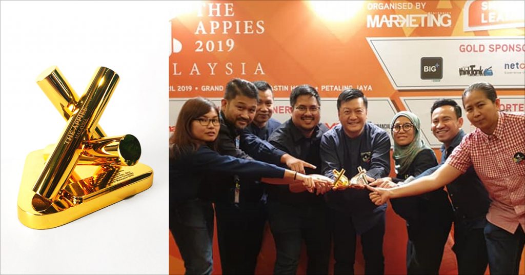 APPIES 2020 Gold Award (left). Team Astana and Petron Malaysia at APPIES Marketing Awards in 2019 (right).