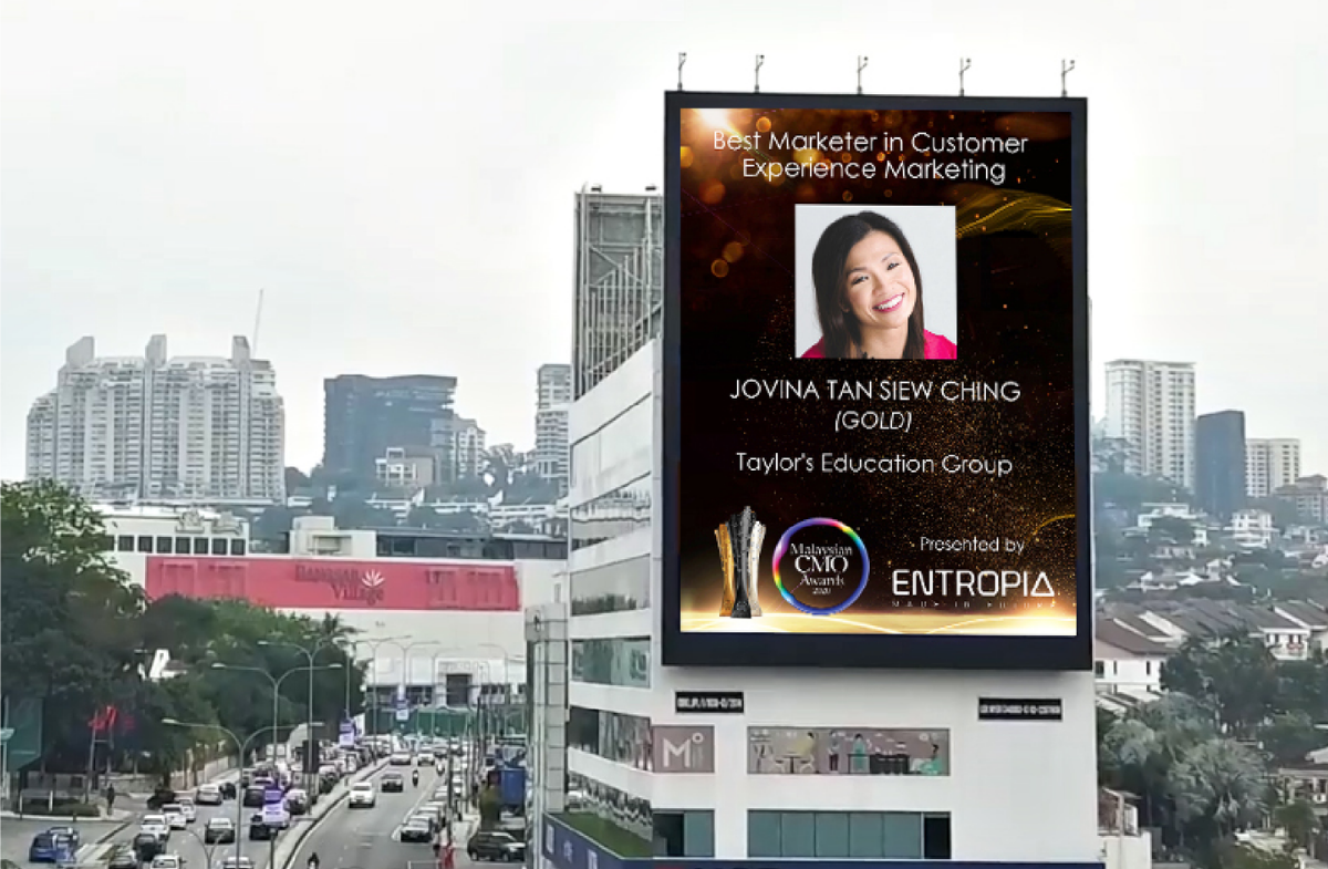 Jovina Tan Siew Ching, Vice President & Head of Group Marketing for Taylor’s Education Group wins Gold for Best Marketer in Customer Experience Marketing, presented by ENTROPIA, at the Malaysian Chief Marketing Officers (CMO) Awards.